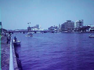 | 4月20日、大東から車で30分の島根県の県庁所在地である松江に出かけた。 松江市は水の都とも呼ばれ、清楚な町である。 市内を南北に分けて流れる大橋川に3本の橋が架かっている。 西から大橋、新大橋、くにびき大橋とある。 午前11時頃であったと思う。 新大橋を通っていると大橋川で、珍しいものを見ることができた。 |