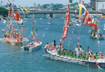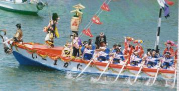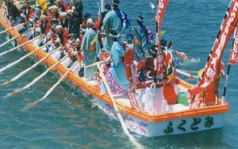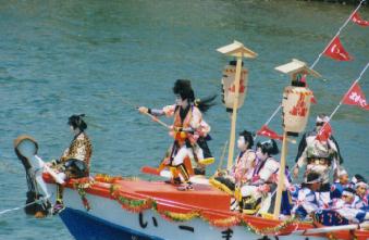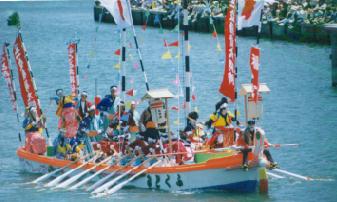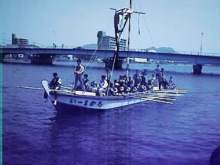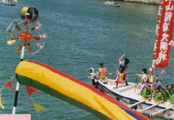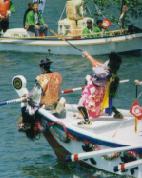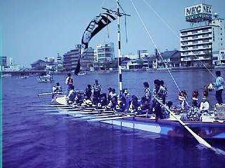 ![]() 12年に一度行われる 「ホーラエンヤ」 三艘の濾こぎの船での 練習風景です。 |